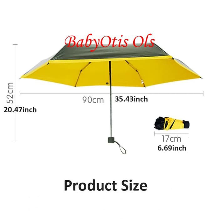 Mini Pocket Umbrella / Payung Lipat Super Mini merk Black LemonPraktis untuk di bawa ke mana-mana karena ukurannya yang Mini.PERHATIKAN lipatan payung sebelum membuka !!!Untuk melipatnya agar rapi kembali satukan seluruh jeruji besi dan rapikan seluruh lipatannya kembali semua seperti pada saat sebelum di buka Berat Bersih : 215gr Umbrella onlyReady Stock :----------------------Pink - ReadyBiru - ReadyFull Hitam - ReadyHijau - ReadyKuning - ReadyNote : Seluruh warna bagian atas payung berwarna Hitam, yang berwarna adalah bagian dalam, jadi kalau Hitam artinya atas dan bagian dalam payung berwarna Hitam. Untuk pilihan warna lihat gambar ke-3Berikan keterangan saat order ya sis dan gan...Payung...Siapa yang tidak butuh payung???Di Indonesia semua orang butuh payung..pada saat panas payung ini sangat di butuhkan karena anti sinar UV.Dan pada saat hujan payung nano mini ini juga gampang dibawah ke mana- mana karena ukurannya yang kecil sehingga gampang di gengam dan tidak menyita tempat di dalam tas.Selain itu Mini Pocket Umbrella / Payung Lipat Super Mini ini juga sudah anti sinar UV yang akan menjaga sis dan gan dari sengatan panasnya sinar matahari.Ukuran yang besar dan berat yang terlalu berat, pasti membuat kamu males untuk selalu membawanya. Eits, jangan sampai kamu nggak membawa payung lho. Sekarang udah ada kok payung lipat dengan ukuran yang pas banget untuk dimasukan ke dalam tas serta berat yang cukup ringan untuk kamu bawa ke mana pun.Happy ShoppingBabyOtis Ols siap ,bisa langsung dipesan boss , agar segera kami p