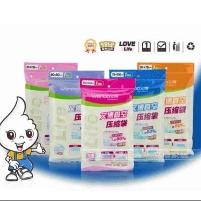 Medium size High Quality Vacuum Bag 60x80 / Vakum Bag / WenboMerupakan Vacuum Bag dengan kualitas bahan yg lebih tebal dan bagussangat cocok untuk menyimpan bed cover, bantal, guling, selimut, boneka, baju dingin sehingga dapat menghemat tempat sampai dengan 80%caa pakai :- isi pakaian, selimut, dll kedalam plastik vacuum dan seal- buka penutup plastik yg ada diluar lalu sedot udaranya dgn vacuum rumah tangga biasa / pompa vacuumUkuran 60x8