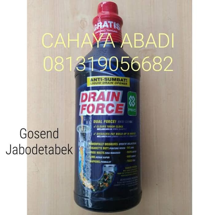 TOP BANGET!ANTI SUMBAT! SODA API AIR.PENGIRIMAN VIA:* GOJEK/GRAB* JNE - JAWA BARATPENGGUNAAN DIANJURKAN (+):WASTAFEL 1/2BOTOL (900GRM)URINAL 1/2BOTOL (900GRM)KAMAR MANDI 1BOTOL (1800GRM)SEPTIC TANK 1-2BTLS (1800-3600GRM)KLOSET/PIPA LEKUK >3BTLS (>5400GRM)SALURAN UTAMA >2BTLS (>3600GRM)FREE Sarung Tangan dibalik bungkusan merah bagian atas..AKSI GANDA: Melancarkan saluran pipa mampet sekaligus melarutkan lemak makanan dalam hitungan menit oleh efek Thermodynamic (panas) yang ditimbulkan sewaktu bercampur dengan air.Bekerja sangat cepat Hemat waktu & biaya.DRAIN FORCE jauh lebih berat daripada air, formula ini akan langsung mengalir ke sumbatan dan segera bekerja.Aman untuk semua sistem plastik perpipaan standar dan septic tank setelah dibilas air.Mengandung anti-korosi (corrosion inhibitor).Membersihkan kerak, lumut, serangga mati & bakteri penyebab bau di saluran.Membantu menetralisir alkali akibat sabun & deterjen.EFEKTIF MELARUTKAN: puntung rokok, sisa makanan, pembalut, lemak, kertas, rambut, kerak kapur, tisu.Larutan konsentrat cair untuk melancarkan kembali saluran pembuangan tersumbat. Seperti pada saluran kamar mandi, wastafel, bathtub, toilet, bak cuci piring, urinal, pancuran air & semua saluran pembuangan berdiameterCARA PEMAKAIAN:1. Tunggu saluran yang tersumbat airnya menyusut.2. Tuang Drain Force ke saluran tersumbat sesuai takaran.3. Diamkan selama 5 menit. ( 15 menit untuk saluran tersumbat total).4. Untuk Closed, penutupnya dibiarkan terbuka saja, karena reaksinya dapat menyebabkan letupan.5. Siram perlahan dengan air hingga saluran dipastikan lancar kembali.6. Jika saluran masih tersumbat, ulangi prosedur seperti di atas. DRAIN FORCE lebih berat dari pada air, formulanya akan menerobos & bekerja langsung ke bagian yang tersumbat.PRODUK CAIRAN area JABODETABEK.Terimakasih sudah belanja ditoko kami. Salam sejahtera selalu. barang tersedia boss , langsung dipesan , akan segera kami p